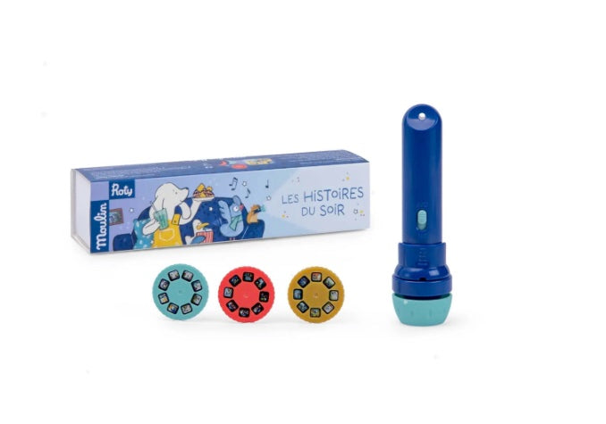 Sous forme de lampe de poche, ce jeu projette des images sur le mur. Il stimule l'imagination des enfants (et des parents) tout en favorisant une routine du soir calme.  Les trois disques comprenant 8 images permettent d'inventer de merveilleuses histoires (24 images totales).
