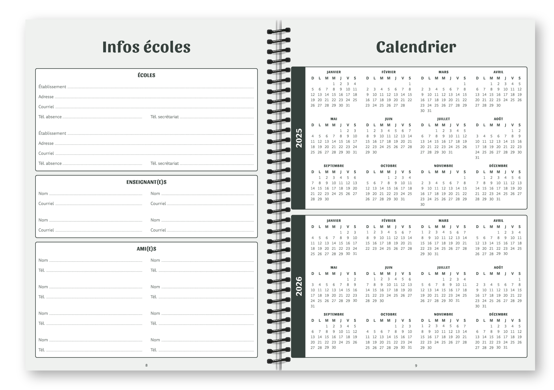 L'année dernière j'avais utilisé cet Agenda pour la première fois. C'était pour moi une belle découverte. Cette année, alors que je ne le retrouvais pas sur les tablettes de ma papeterie, j'ai visité votre site et j'ai commandé le même agenda. La grandeur est parfaite, la largeur des colonnes me permettent d'écrire ce que j'ai à écrire, plusieurs pages pour chaque mois, une plage horaire pour des gens actifs du matin au soir, des idées d'activités pour les saisons, la couverture est souple, ce que j'aime, et la reliure est solide. Je l'ai trainé partout avec moi et je vais heureusement continuer de le garder à mes côtés. Merci!