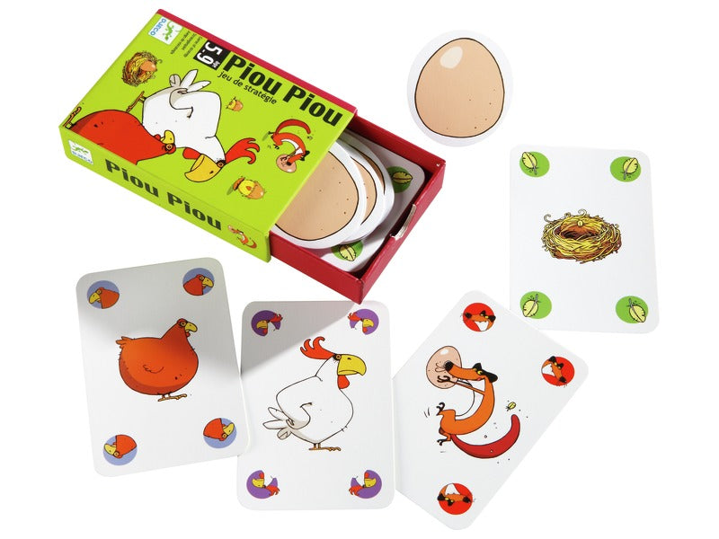 Piou Piou est un petit jeu de cartes de stratégie drôle et addictif qui captive aussi bien les enfants que les parents. Le principe est simple : ponds tes œufs, protège-les du renard, et sois le premier à voir éclore 3 poussins pour remporter la partie!